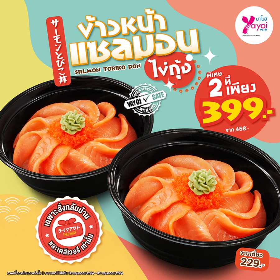 ร้านอาหารญี่ปุ่นยาโยอิ ต้นตำรับความอร่อยสไตล์ญี่ปุ่น พร้อมส่งความอร่อยสุดคุ้มกับเมนูใหม่ สำหรับบริการซื้อกลับบ้านและเดลิเวอรี ปักหมุดสำหรับคนรักแซลมอน กับ ข้าวหน้าแซลมอนไข่กุ้ง (Salmon Tobiko Don) ในราคาพิเศษเซตคู่สุดคุ้ม 2 ที่ เพียง 399 บาท (ปกติ 458 บาท) และสำหรับลูกค้าบัตรสมาชิกยาโยอิ ซื้อกลับบ้านยิ่งคุ้มไปอีก รับฟรี เกี๊ยวซ่า 1 ที่ ถึง 31 พ.ค.นี้เท่านั้น!