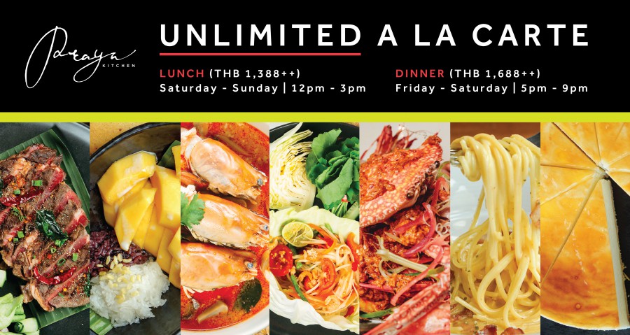 กลับมาให้หายคิดถึงรูปแบบ “ตามสั่ง – อิ่มไม่อั้น” เหล่าบรรดาเชฟมากฝีมือจากห้องอาหาร พระยาคิทเช่น นำทีมโดยเชฟสมคิด เกตุแก้ว เตรียมอาหารไทยรสจัดจ้านกว่า 70 เมนูให้คุณอิ่มอร่อย ยังมีเสิร์ฟครบทุกหมวดหมู่ ไม่ว่าจะเป็นสลัด, ซาซิมิ, ซีฟู้ด ออน ไอซ์, พาสต้า, ติ่มซำ, บาร์บีคิว และขาดไม่ได้กับไฮไลท์ของทางร้าน เมนูอาหารทะเล และเนื้อย่าง เลือกอิ่มจุใจได้ตั้งแต่กุ้งลายเสือ, กุ้งแม่น้ำ, ปูม้า, หอยแมลงภู่, หอยหลอด สำหรับสายเนื้อ ฟินไปกับเนื้อออสเตรเลียน วากิว ที่มีมาให้เลือกหลากหลายเช่น เนื้อสตริปลอยน์ (Striploin), , ริบ อายส์ (Ribeye) และดี รัมพ์ (D-Rump)