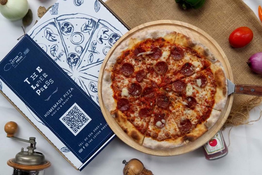 พิซซ่า จาก ห้องอาหาร The Letter Press “The Printing House Poshtel” เป็นพิซซ่าโฮมเมด ทำ สด ใหม่ ทุกออเดอร์ ในราคาจัดต้องได้ เริ่มต้น 199 บาท มีทั้ง Chicken BBQ Pizza | ไก่บาร์บีคิว,Hawaiian Pizza | พิซซ่าฮาวาเอียน, Pizza Margherita | พิซซ่ามาเกอริต้า, Four Cheese Pizza | พิซซ่าโฟร์ชีส,Ham & Mushroom Pizza | พิซซ่าแฮมและเห็ด, Pepperoni Pizza | พิซซ่าเปปเปอร์โรนี