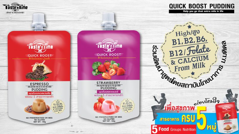 โดยมี ดร.บวร วิเชียรสินธุ์ กรรมการผู้จัดการ บริษัท วิชไวย์ กรุ๊ป จำกัด มาให้รายละเอียด พร้อมชูความเป็นนวัตกรรมกับตัวสินค้าที่เป็นผลิตภัณฑ์ใหม่ยังไม่เคยมีจำหน่ายที่ไหนมาก่อนในประเทศไทย โดดเด่นด้วยความเป็นพุดดิ้งพร้อมรับประทาน พร้อมสารอาหารครบ 5 หมู่ ได้แก่ โปรตีน คาร์โบไฮเดรต ไขมัน วิตามินและเกลือแร่ พร้อมเพิ่มสารอาหารที่ช่วยบำรุงสมอง อาทิ B1 B2 B6 B12 และ Folate ซึ่งมีคุณค่าทางโภชนาการเหมาะกับผู้ที่ต้องการรับประทานอาหารเพื่อสุขภาพทุกเพศทุกวัย ด้านบรรจุภัณฑ์ บรรจุในถุง pouch ขนาด 150 ml สะดวกสบายในการพกพา มี 2 รสชาติ คือ รสกาแฟ เอสเปรสโซ และรสสตอเบอรี่ มีจัดจำหน่ายแล้วที่ Gourmet market, Home Fresh Mart และVilla Market สำหรับผู้ที่สนใจในผลิตภัณฑ์สามารถติดตามข่าวสาร และสั่งซื้อได้ทาง FB: tastentime Line : @Tastentime หรือที่ www.Tastentime.com